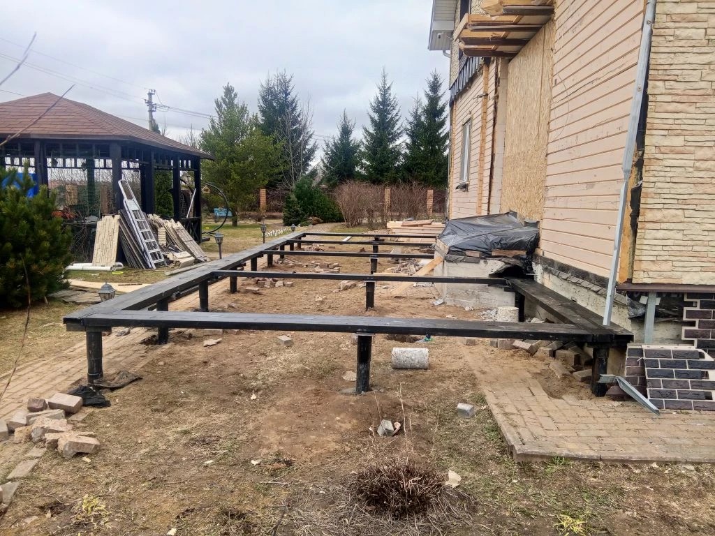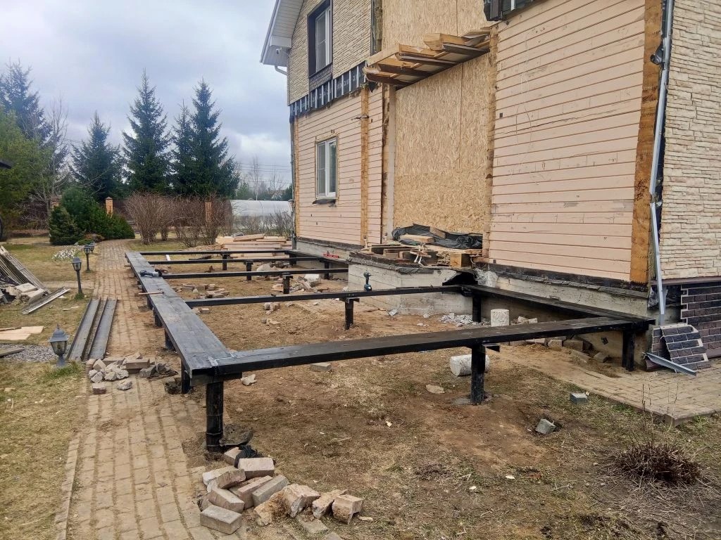 —Фундамент для будущей веранды-оранжереи из 15 винтовых свай и двух швеллеров под стены из бревна