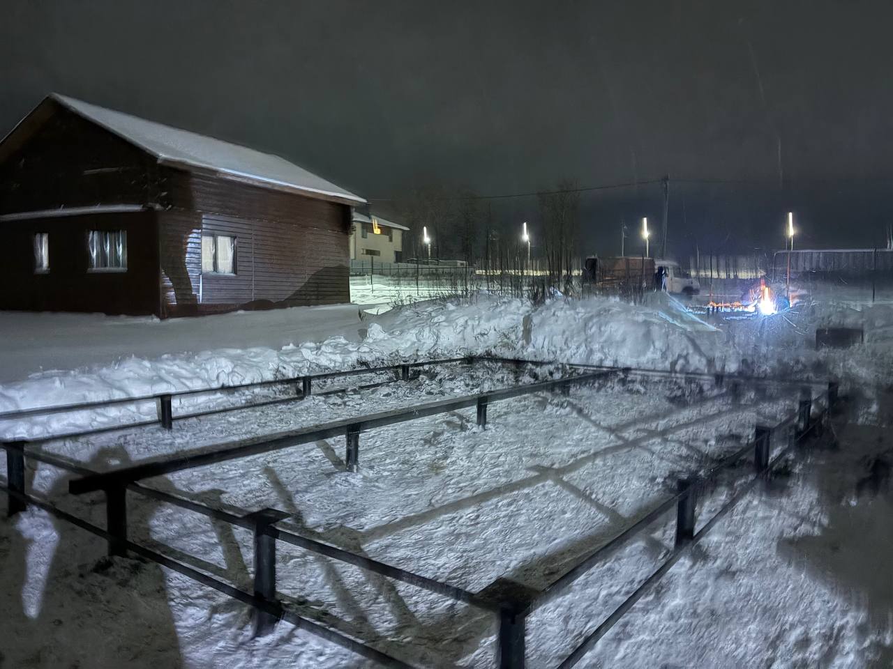 Процесс погружения винтовых свай проходил под строгим контролем уровня. Каждая свая завинчивалась на глубину ниже уровня промерзания почвы, что гарантирует стабильность фундамента в любое время года. После того как все опоры были установлены, мы произвели их обрезку по единому горизонтальному уровню и заполнили полости цементно песчаной смесью для предотвращения коррозии изнутри. Завершающим этапом монтажа стала приварка оголовков. Несмотря на то что рабочий день затянулся и финальные кадры были сделаны уже в сумерках, на качестве работы это никак не отразилось. На вечерних фото можно заметить легкую дымку и недостаток освещения, но даже в таких условиях видна четкая геометрия и аккуратность каждого сварного шва.
