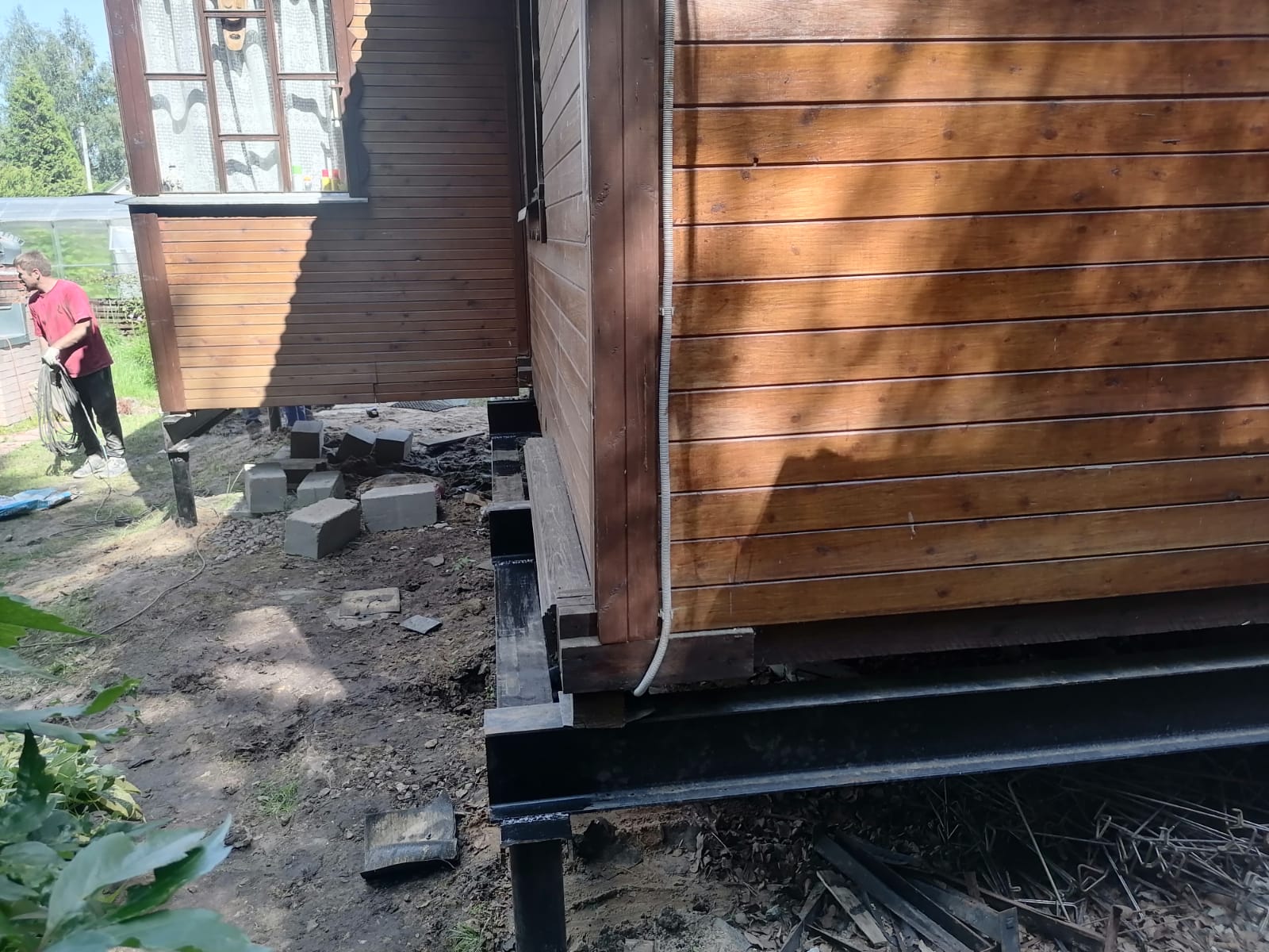 На винтовые сваи была установлена двутавровая металлическая балка с высокой несущей способностью (200 мм), которая служит основой для вашего дома. Эта балка обеспечивает равномерное распределение нагрузки и повышенную устойчивость всей конструкции. Дом был аккуратно поднят и установлен на новом фундаменте, а затем тщательно проверен, чтобы убедиться в его стабильности и надежности.