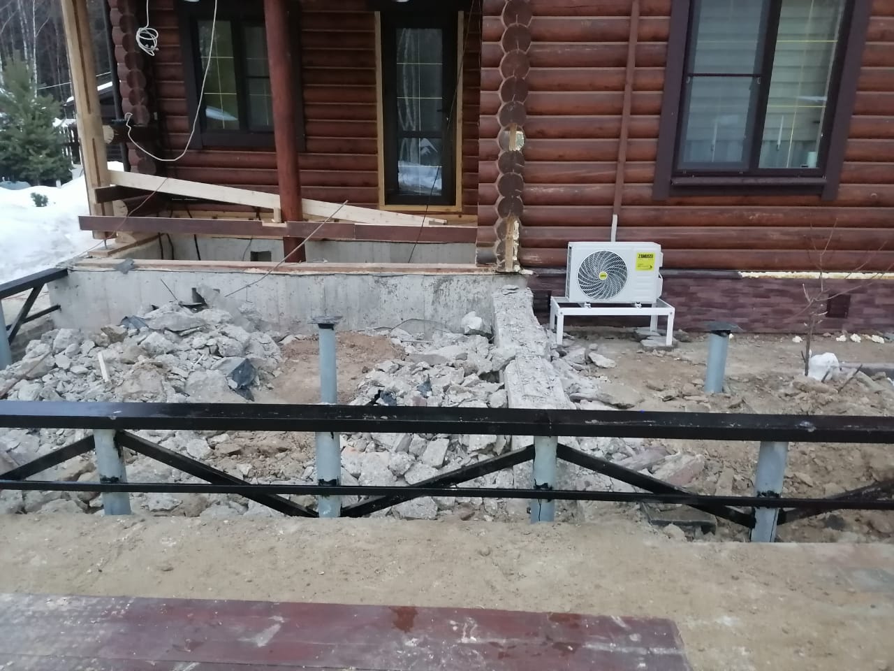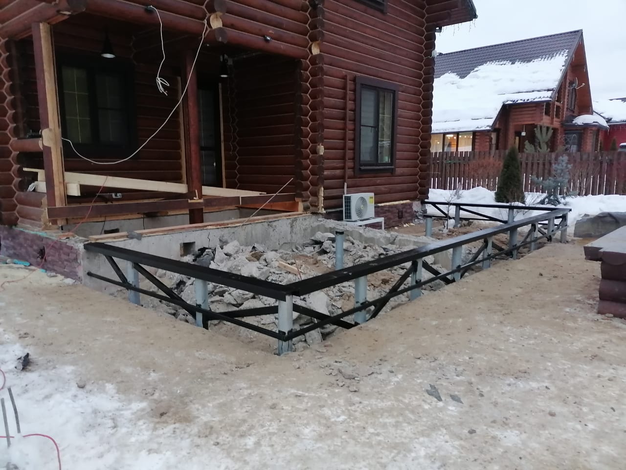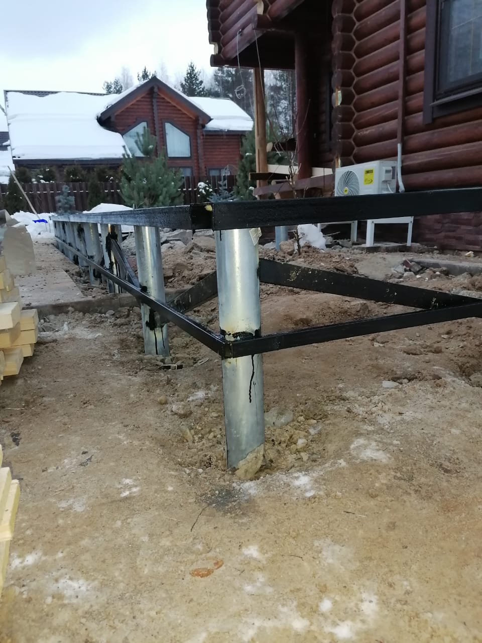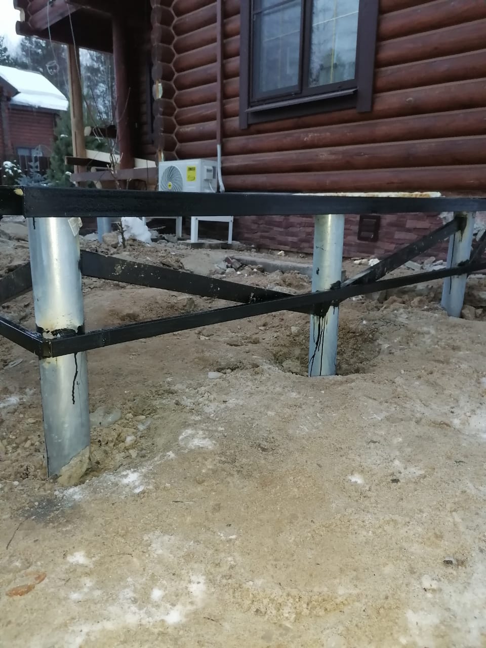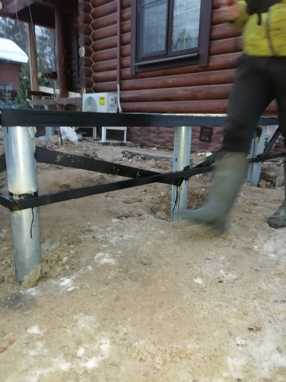 Монтаж винтовых свай оцинкованных с обвязкой швеллером и профильнной трубой для строительства пристройки и стеклянного ветража под сад внутри дома.